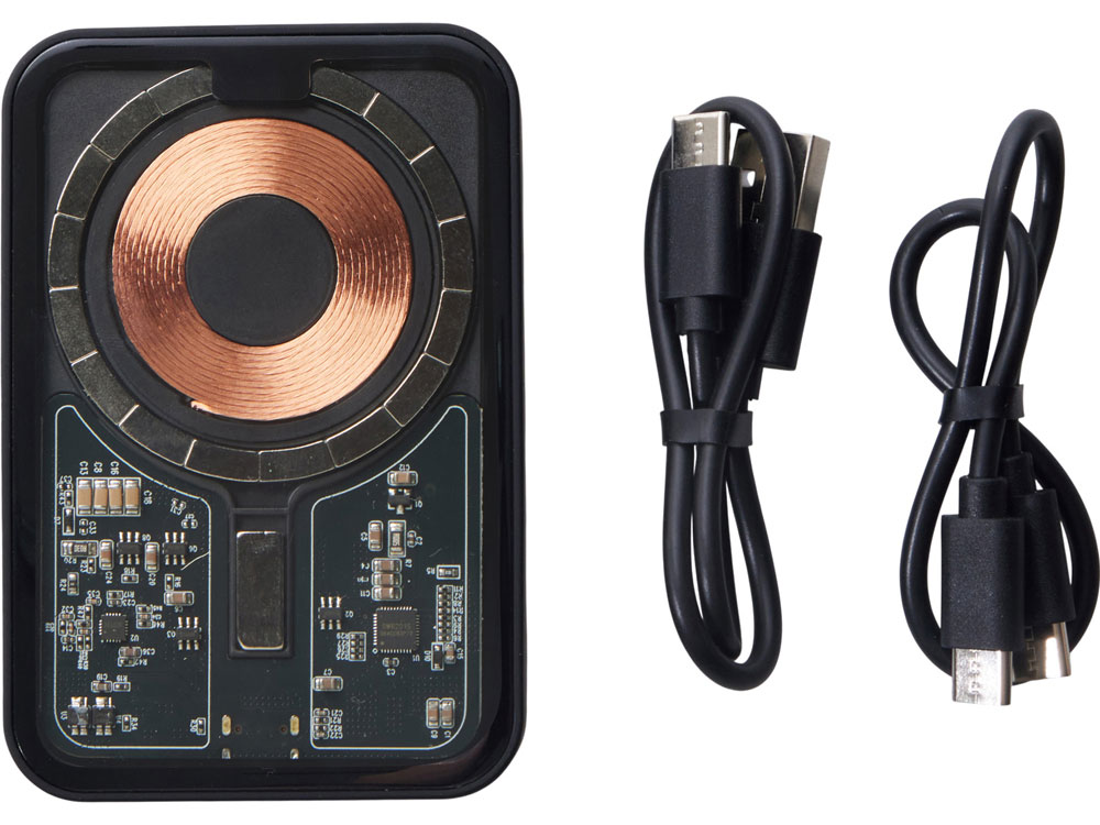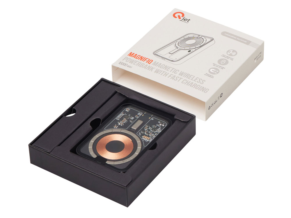Беспроводной магнитный внешний аккумулятор MagnifIQ — технологичный и стильный power bank с эффектной прозрачной передней панелью, сквозь которую видны мощные магниты, индукционная катушка и электронная начинка. Ёмкость 10 000 мА·ч обеспечивает до 2–3 полных зарядов смартфона, а поддержка быстрой беспроводной зарядки до 15 Вт (с совместимостью QC/PD) делает процесс зарядки максимально быстрым и удобным. Двунаправленный USB-C порт позволяет как заряжать другие устройства, так и сам аккумулятор. Обе стороны корпуса подходят для нанесения логотипа: лицевая — через прозрачную панель, задняя — на приятное на ощупь soft-touch покрытие. Компактный, надёжный и сильный — идеальный технологичный продукт для продвижения и ежедневного использования. Поставляется в качественной упаковке с шубером, Двунаправленный кабель USB-C и кабель USB-A – USB-C в комплекте. • Прозрачная передняя панель — демонстрирует внутреннюю «начинку» и подчеркивает технологичность бренда. • Магнитная беспроводная зарядка 15 Вт • Ёмкость 10 000 мА·ч — хватает на несколько полных зарядов смартфона. • Двунаправленный USB-C — универсальность для зарядки и подзарядки. • Две зоны нанесения логотипа: на прозрачную панель спереди и на soft-touch покрытие сзади. • Сильные магниты обеспечивают надёжную фиксацию на совместимых устройствах.