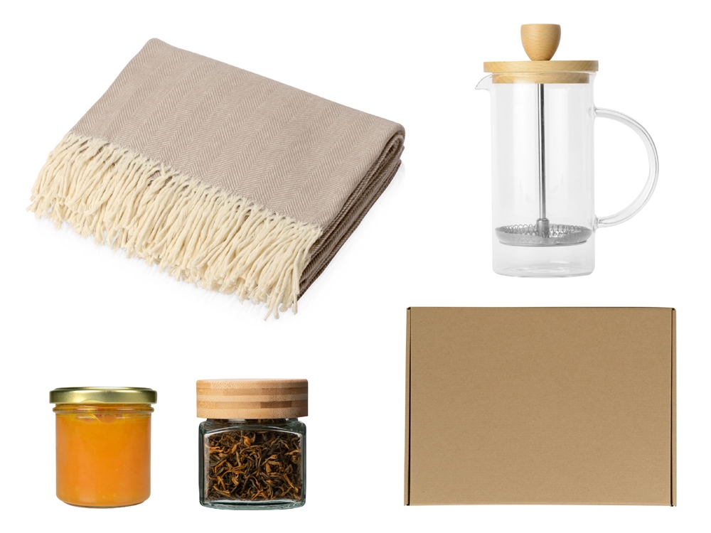 Такой набор — это прекрасный подарок для тех, кто ценит уют и любит наслаждаться ароматным чаем наедине с собой или в приятной компании. Элегантный френч-пресс с крышкой из букового дерева изготовлен из термостойкого боросиликатного стекла, а поршень и пресс-фильтр с уплотнительным кольцом из высококачественной пищевой нержавеющей стали марки 304. Его объем рассчитан на одну стандартную кружку или две небольшие кофейные чашки. Френч-пресс идеально подойдет для заваривания не только кофе, но и чая или любых травяных напитков. Плотный мягкий плед из натурального хлопка украшен бахромой. Можно использовать как теплое одеяло или как покрывало для украшения интерьера. Чай «Дянь Хун» отличается терпким вкусом с оттенком мёда, он хорошо омолаживает, бодрит и поднимает настроение на целый день. А неожиданный дуэт мандаринов и белого шоколада в варенье — настоящая находка для ценителей редких, оригинальных вкусов. - ручка френч-пресса не нагревается; - размер пледа 150 х 180 ( ±5) см; - вес чая: 40 гр; - стеклянная банка сохраняет аромат чая; - подарочная коробка входит в набор. Максимально рекомендованная температура воды для френч-пресса составляет 120℃. Не рекомендуется использовать в посудомоечной машине и микроволновой печи.