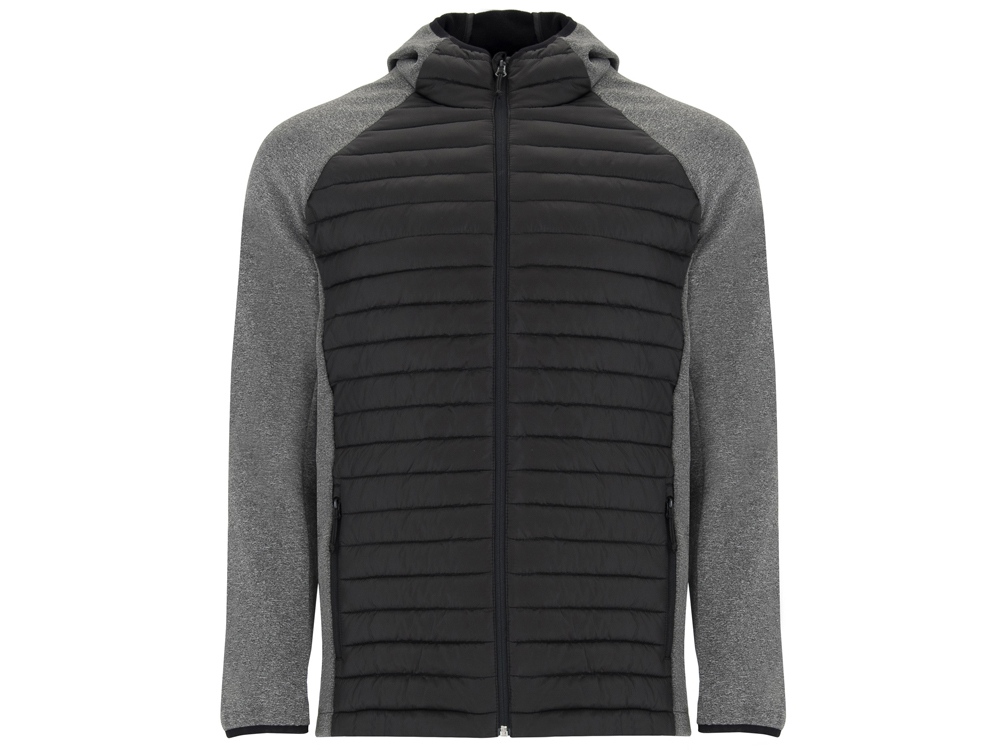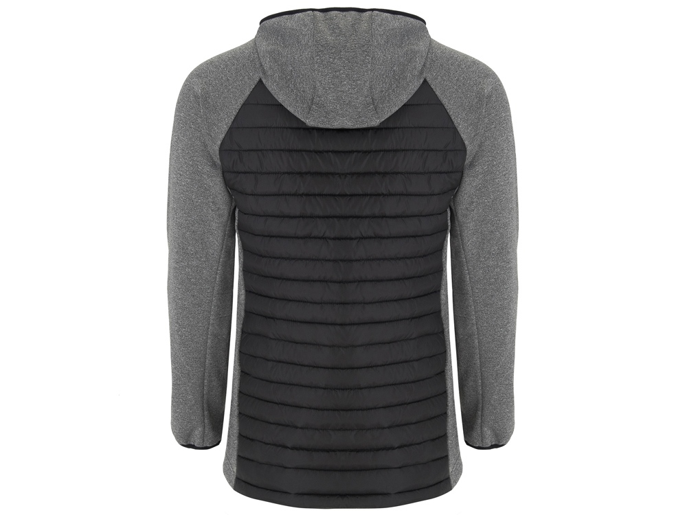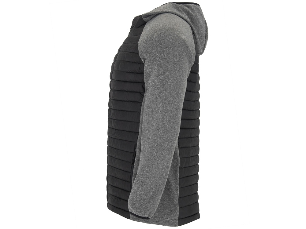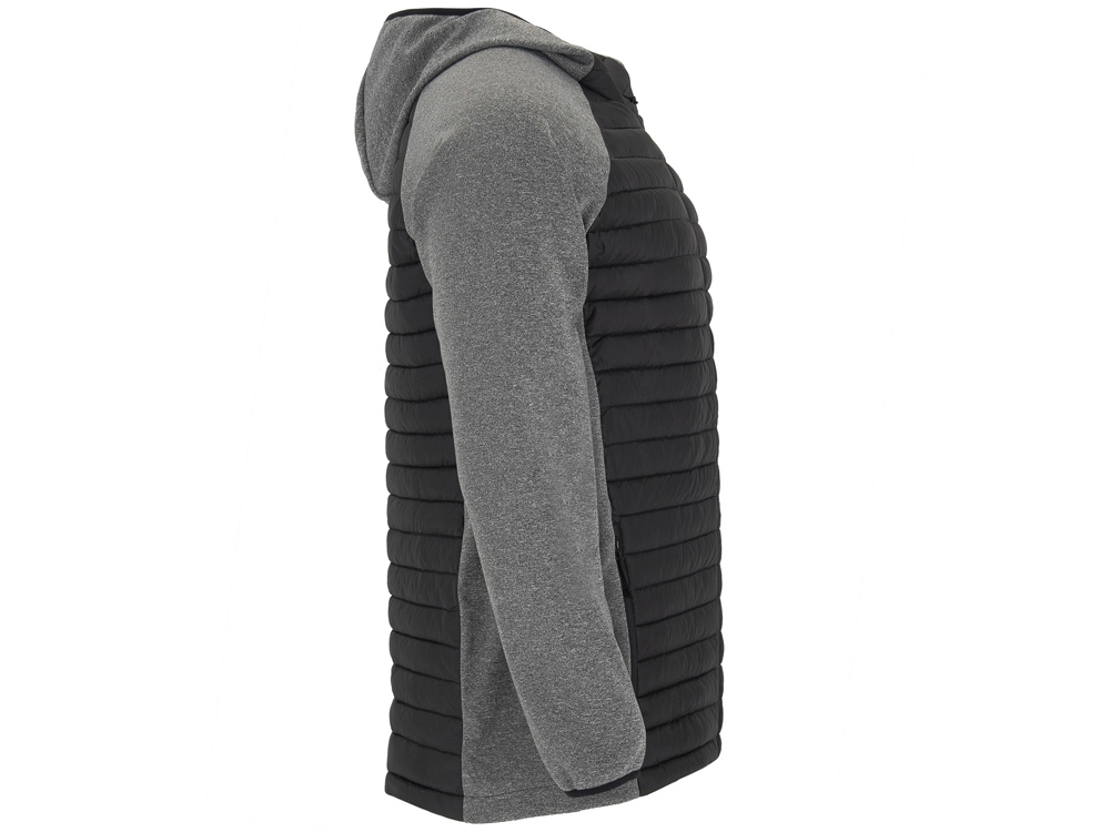 Мужская куртка из двух комбинированных тканей. - Несъемный регулируемый капюшон. - Рукава реглан. - Ткань softshell на рукавах, боковых вставках и капюшоне. - Стеганая ткань с утеплителем спереди и сзади. - Молния в тон с бегунком и защитой для подбородка. - Два кармана спереди с молнией. - Воротник, манжеты и низ с эластичной окантовкой в тон.