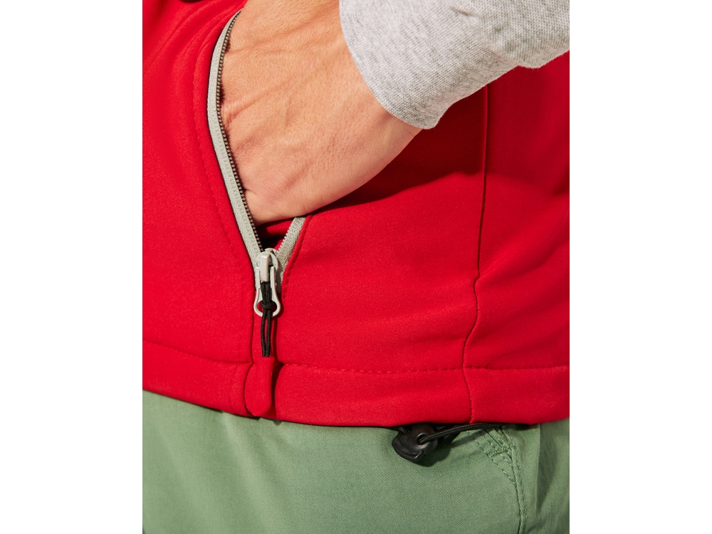 Жилет из 2-х слойного софтшелл материала. - Контрастная водоотталкивающая молния с защитой для подбородка. - Три внешних кармана на молнии с бегунком в тон. - Низ с эластичным шнуром и регуляторами.