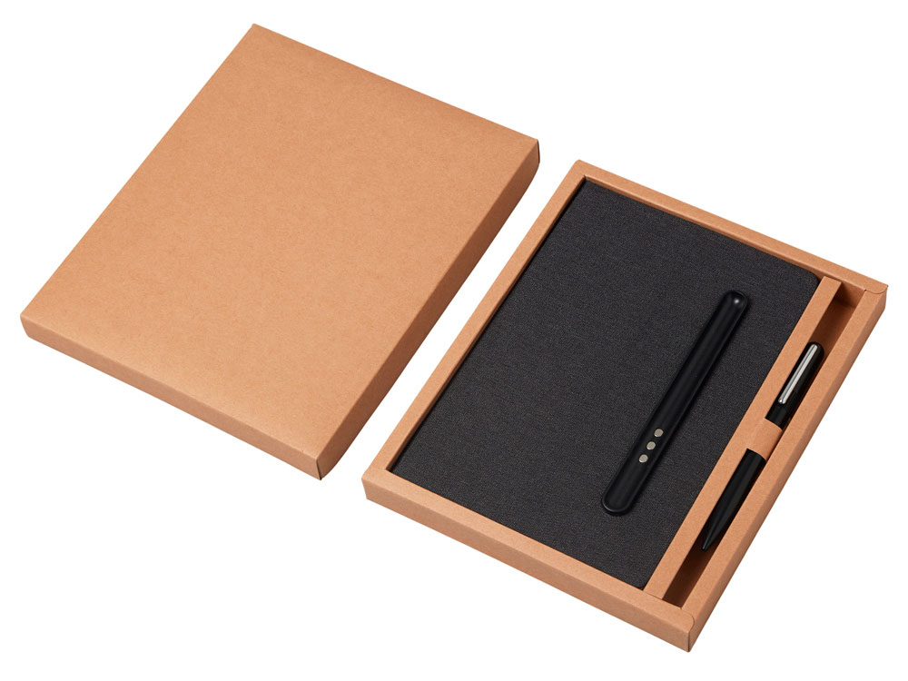Блокнот в твердой обложке из rpet-пластика с металлической шариковой ручкой. В обложке магнитный держатель для ручки. Также верхняя часть обложки трансформируется в подставку для телефона. В блокноте 80 листов бумаги 70 г/м2.