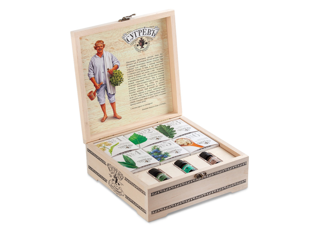 Умный, вкусный, полезный и профессиональный подарок для истинных ценителей русской бани: польза в каждой чашке. Подарочный набор для бани представляет собой сувенирную деревянную шкатулку из массива берёзы, посвящённую истории бани и банного чаепития. В набор входит составленный на основе рекомендаций пармейстеров и травников сет из 6 полностью натуральных чаёв и чайных напитков (не содержат ароматизаторов и красителей), а также 3 эфирных масла. Цифровые коды на чаях облегчают навигацию. На упаковке даны рекомендации по правильному употреблению этих функциональных чаёв и описание производимого ими эффекта. Этот набор – гармония природы, здоровья и вкуса, которые идеально дополнят банный ритуал. Состав: - №1- липа, таволга, шиповник, иван-чай. - №2 - чай зелёный, саган-дайля, лист берёзы. - №3 - корень дягиля, душица, лист смородины, чёрный чай, кора дуба. - №4 - лист эвкалипта. - №5 - хвоя пихты, ягоды можжевельника, лист бадана, лист земляники, иссоп. - №6 - корень хрена, корень имбиря, лист смородины, лимон, иван-чай. - Набор эфирных масел: эвкалипт, мята, анис.