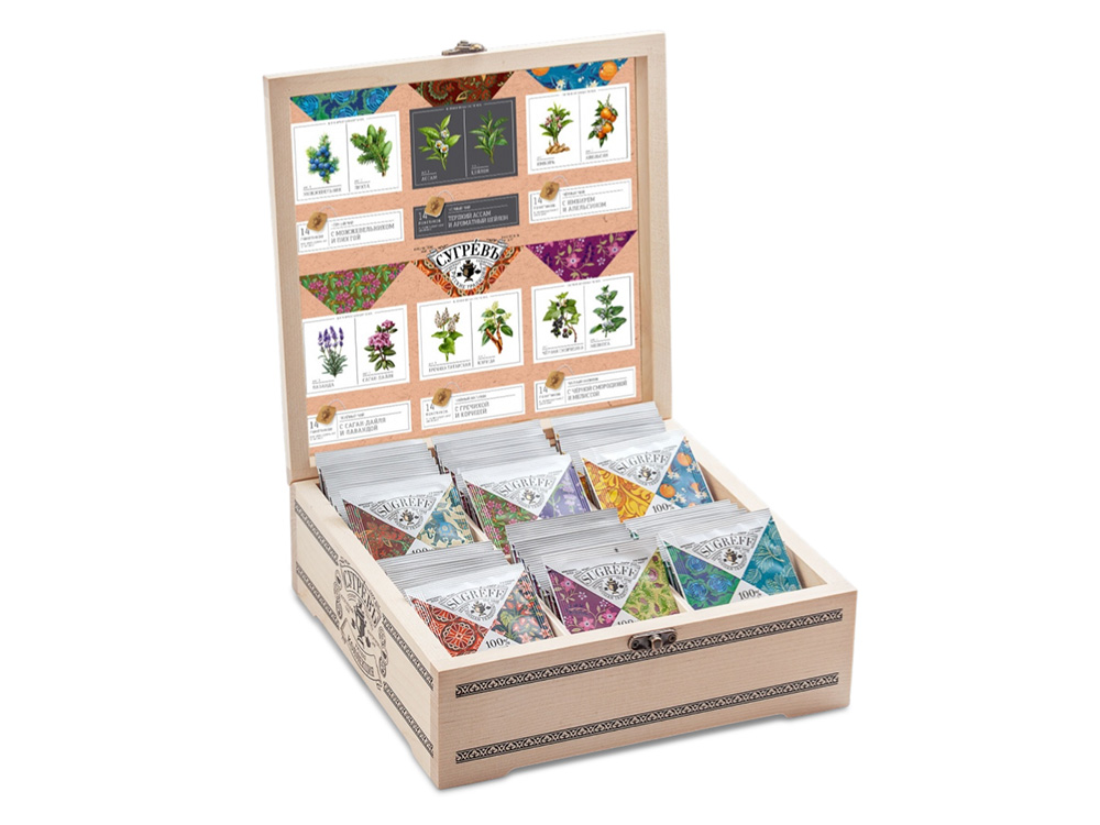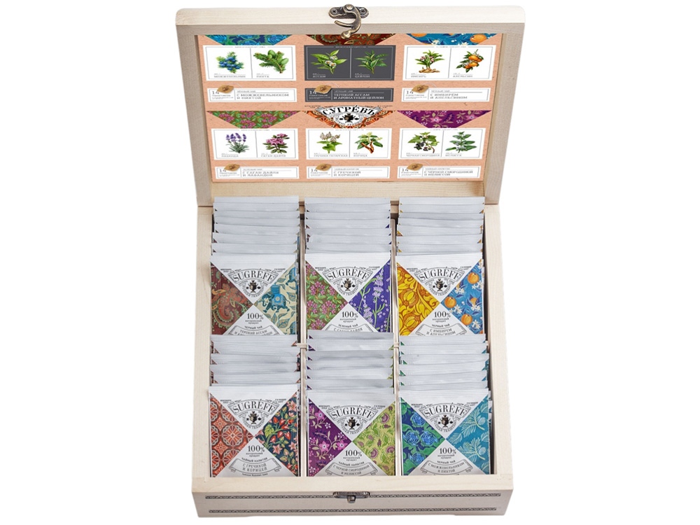 Набор представляет собой коллекцию из 6-и оригинальных купажей чая и чайных напитков в индивидуальных саше. В отличие от обычных пакетированных чаёв, наша продукция 100% натуральная. Яркие ароматы создаются благодаря естественному букету таких растений, как имбирь, апельсин, лаванда, пихта, можжевельник, чёрная смородина, мелисса и саган дайля. Набор многофункционален. Шкатулка с пакетиками будет эффектным и функциональным украшением вашей кухни или гостиной. В качестве чайного мини-дисплея она удобна для использования в офисе. Кроме того, набор является прекрасным подарком. В шкатулке находится 84 саше, по 14 на каждый из 6 вкусов. Состав: - Чай черный "Терпкий ассам и ароматный Цейлон" : чай черный индийский, чай черный цейлонский. - Чай черный "С апельсином и имбирем" : чай черный индийский, цедра апельсина, имбирь. - Чай черный "С можжевельником и пихтой" : чай черный индийский, ягоды можжевельника, хвоя пихты. - Чай зеленый "С саган-дайля и лавандой" : чай зеленый китайский, саган-дайля, лаванда. - Чайный напиток "С гречихой и корицей" : семена гречихи татарской в гранулах, корица. - Чайный напиток "С черной смородиной и мелиссой": лист черной смородины, мелисса, лимонная трава.